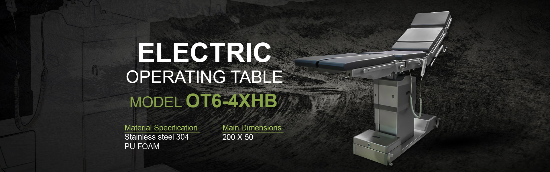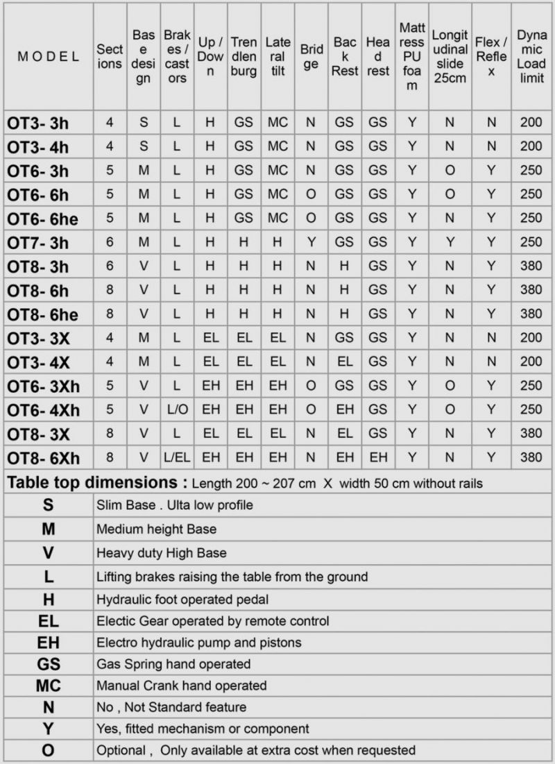 OT- (series) of operating tables incorporates wide range of electrically operated actuated “X” type Universal side rails for use of accessories and attachment from any source are standard on all OT series of operating tables, matching them to the IEC standards of safety and quality